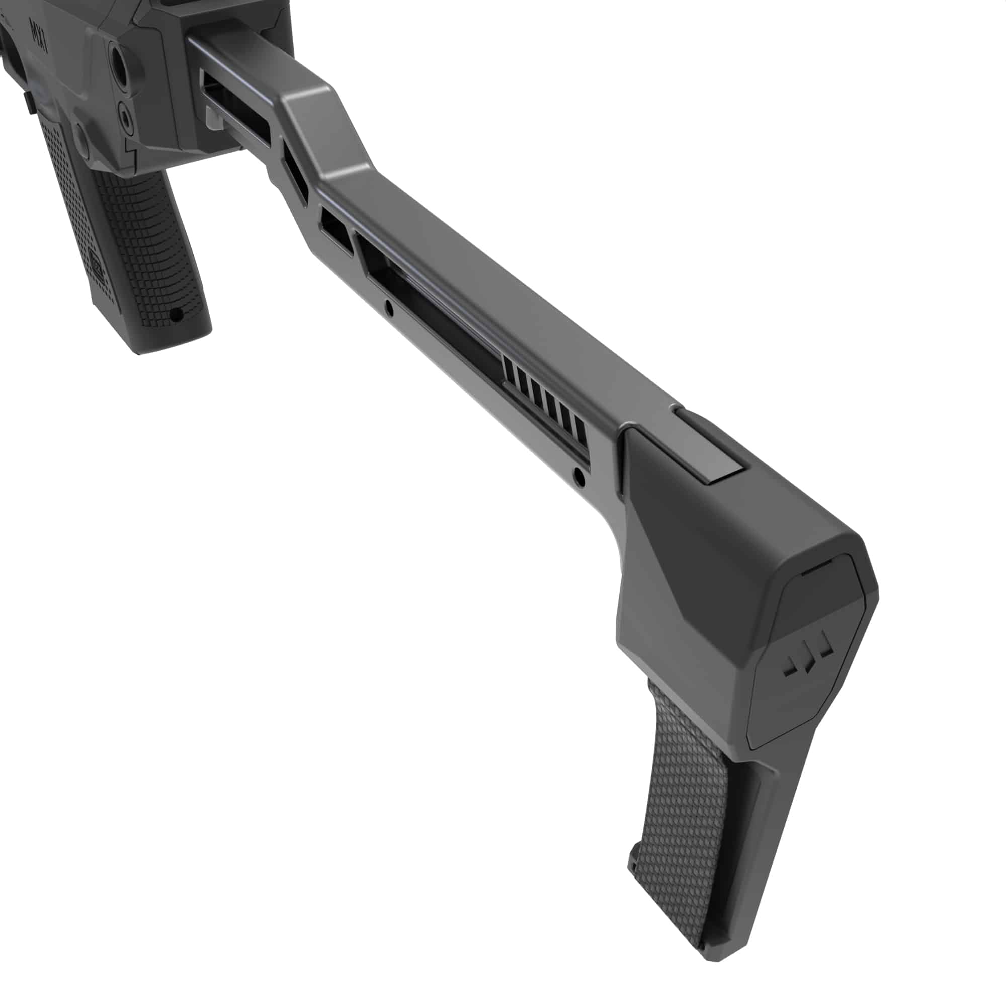 Crafted with aircraft-grade aluminum in key structural areas while maintaining a lightweight polymer price, the MX-1 balances strength and portability. Its advanced AR-style charging system ensures smooth operation, while the foldable stock or stabilizer makes it easy to transport and deploy. The patented tool-free locking system allows for quick and secure handgun insertion, maximizing efficiency in any scenario.